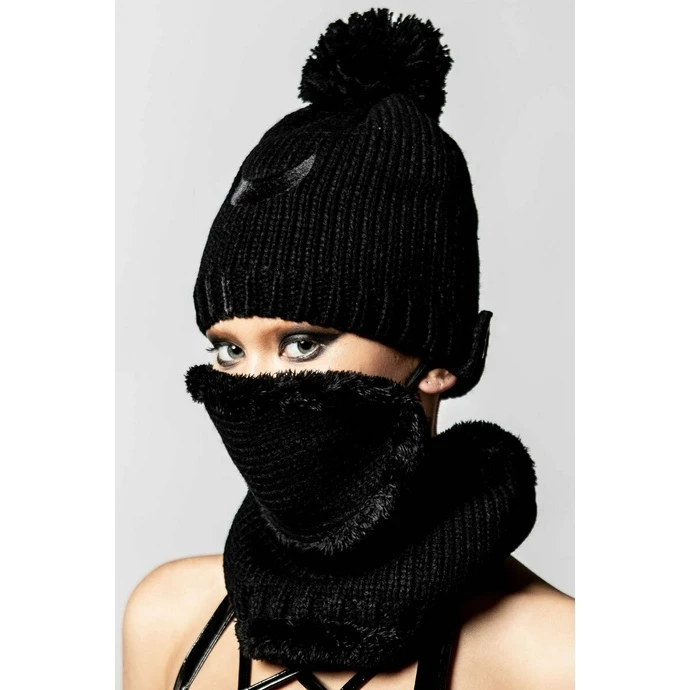 Set includes: knitted beanie with pompom, neck warmer and veil.