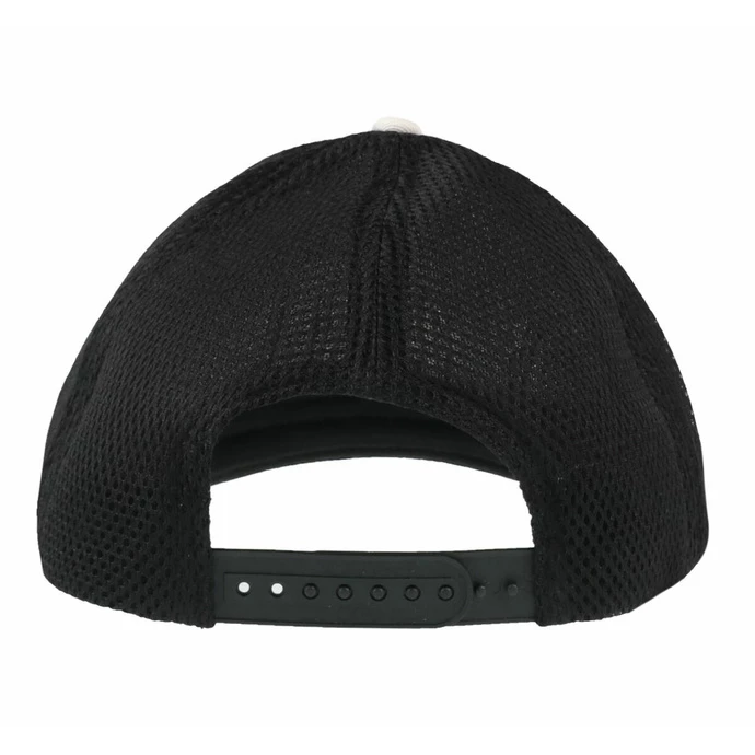 The cap is mesh in the back and equipped with an adjustable buckle – for universal head size.