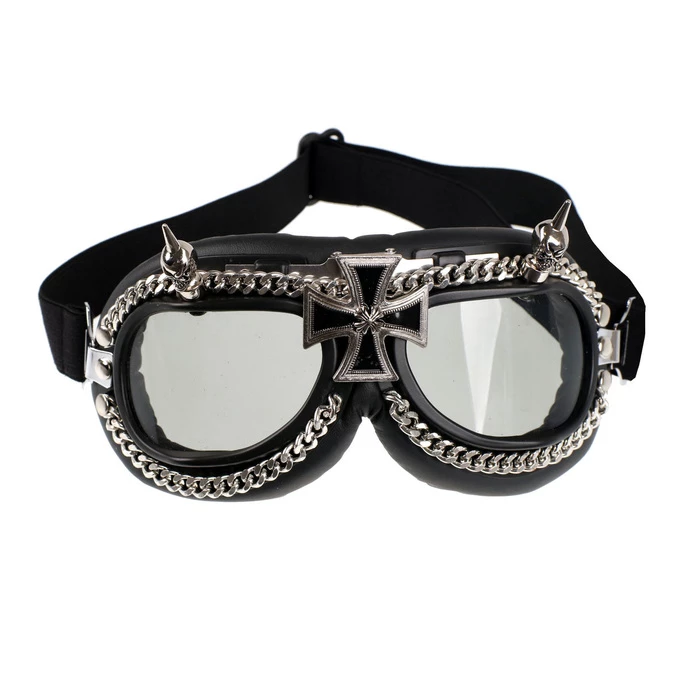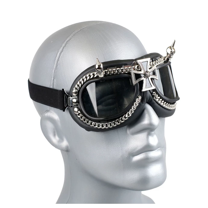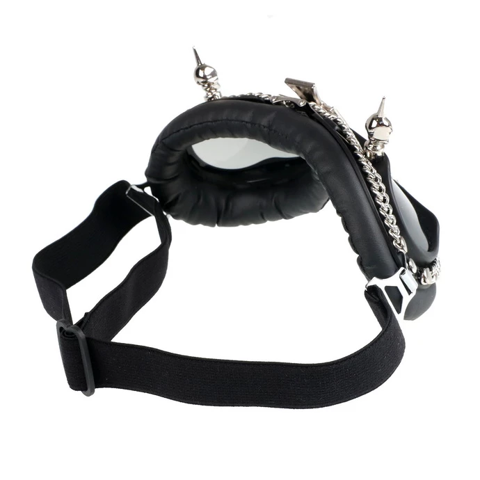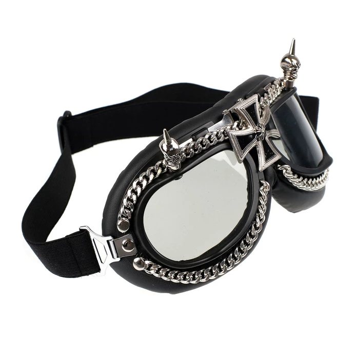 Decorative NONDIOPTRIC glasses. Sunglasses are slightly dark (darkens to grey), frames are made of PVC, soft padding is made of synthetic leather. Glasses are also decorated with metal elements. Composition: PVC lenses, PVC frame, polyester, synthetic leather (PU), metal accessories.