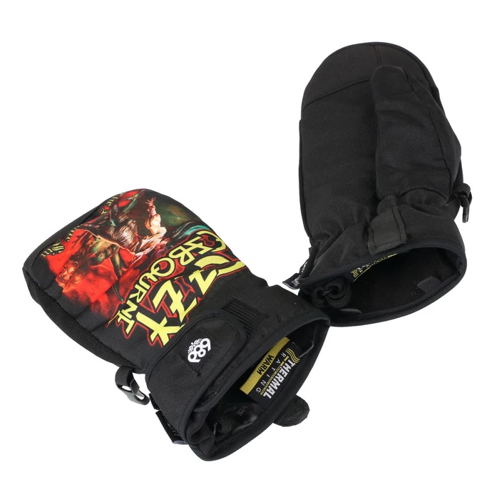 Quality winter gloves Ozzy Osbourne. Brand: 686. Ideal for the mountains (snowboards or skis) even in bad, frosty weather, or as stylish gloves in the city. Material – infiDRY® 10k.Thanks to this quality membrane the height of the water column is: 10,000 mm, breathability: 10,000 g / m2 / 24 h. Glove equipment: insulation There is one chamber inside the glove (all four fingers are together) the gloves have an infiDRY® 10k membrane to prevent moisture from penetrating inside the glove palms are made of a technical leather velcro fastening on the wrist original print Composition: 100% polyester.